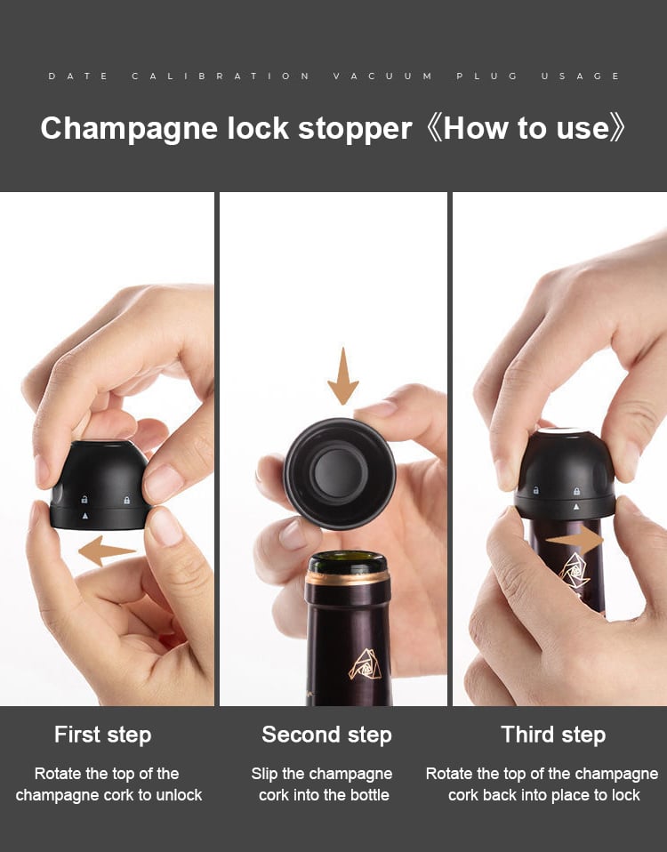 The bottle opener adopts a rotating design, which is more efficient and easier to use. It can be unlocked by rotating the upper part of the cork, and then tightly plug it into the bottle mouth, and then turn the champagne cork. The upper part is locked back to the position to save sealing.